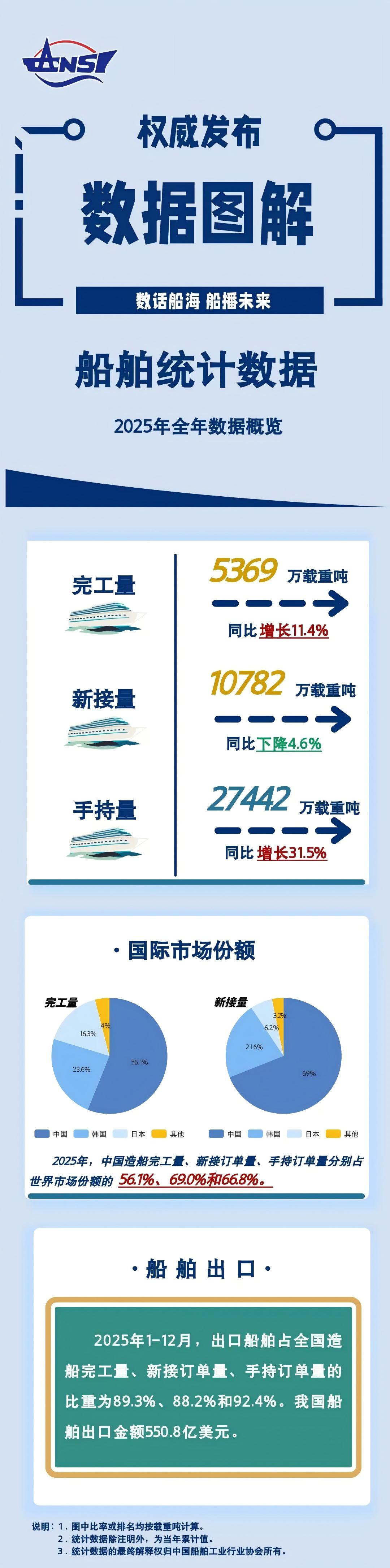 2025年1-12月,我国造船完工量5369万载重吨,同比增长11.4%,占世界总量的56.1%;新接订单量10782万载重吨,同比下降4.6%,占世界总量的69.0%;截至12月底,手持订单量27442万载重吨,同比增长31.5%,占世界总量的66.8%。我国造船三大指标国际市场份额连续16年保持全球领先。