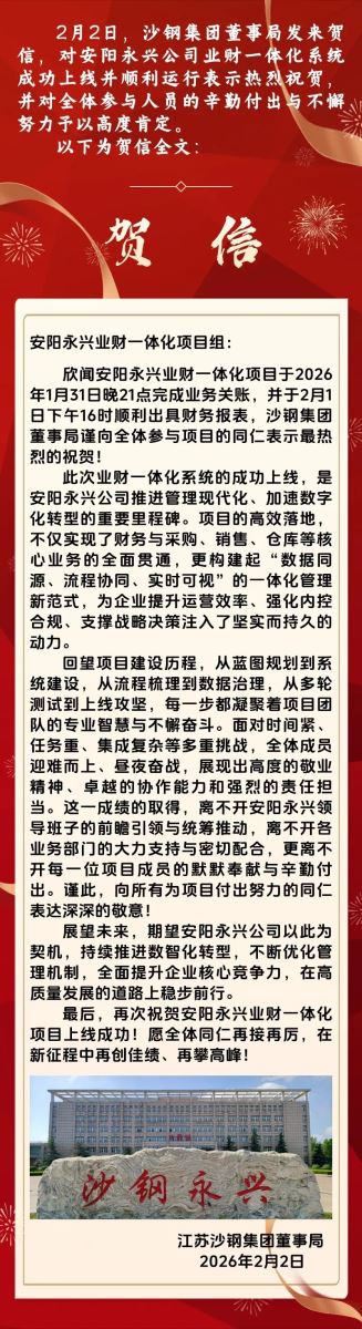 贺信!沙钢集团致信祝贺业财一体化系统上线工作进展顺利