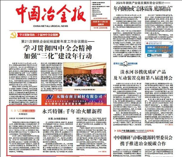 11月6日,《中国冶金报》头版刊登沙钢永兴公司发展纪实文章——《永兴特钢:千年冶火耀新程》。