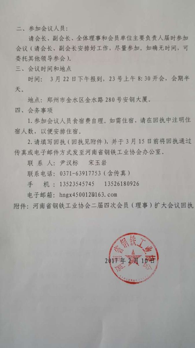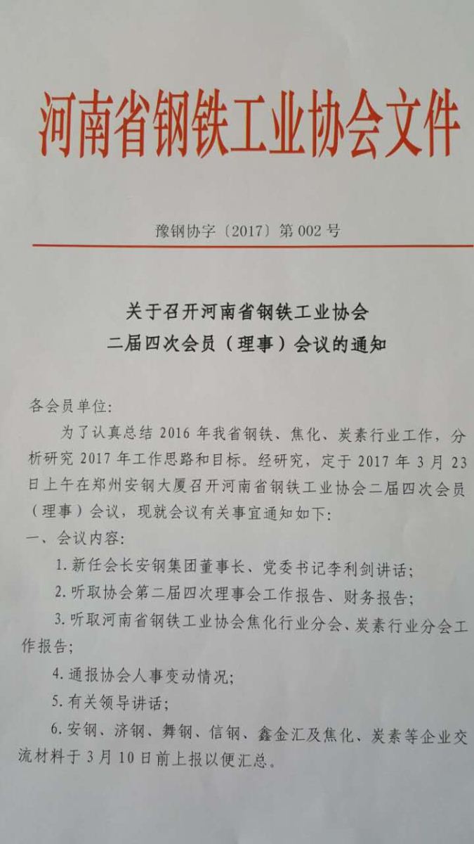 关于召开河南省钢铁工业协会二届四次会员(理事)会议的通知