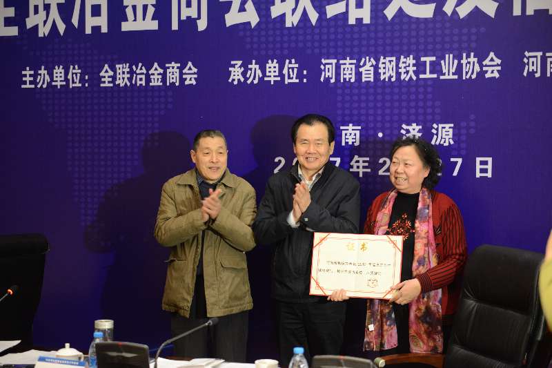 全联冶金商会河南联络处获得全联冶金商会2O16年度先進单位,原名誉会长赵喜子给河南联络处颁奖