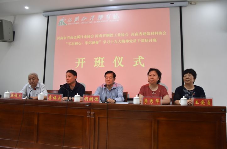 在开班仪式上,大别山干部学院商学院执行院长胡朗德首先致辞,简要介绍了大别山从建党到新中国成立28年红旗不倒的革命历史和学院的基本情况,勉励大家不忘初心,牢记使命,弘扬精神,砥砺前行;中共河南省纪委委员、河南省钢铁协会副会长、安阳钢铁集团公司党委常委、纪委书记李福永讲话时要求大家牢记党的宗旨,做到真学真悟,严格遵守纪律;随后,胡朗德和李福永共同为学习班进行了授旗。河南省钢铁工业协会原副会长李秀华,河南省建筑材料协会会长王爱贞,河南省冶金研究所有限责任公司总经理罗春祥出席,河南省有色金属行业协会原副会长苏俊杰主持开班仪式。