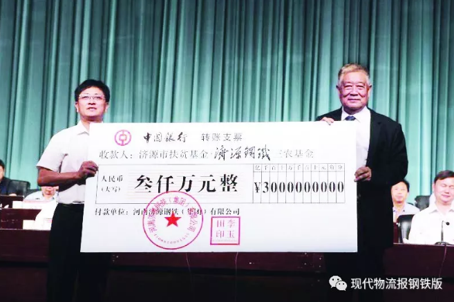 公司董事长、总经理李玉田(图中)代表济源钢铁捐赠3000万元设立“济源市扶贫基金•济源钢铁三农基金”
