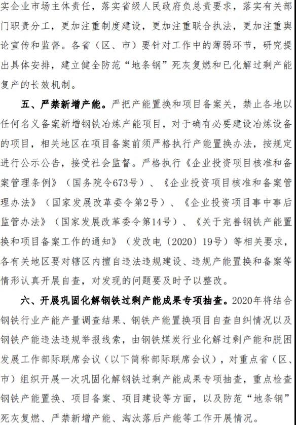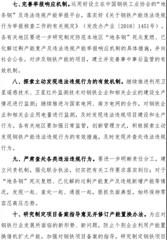 该《通知》表示,国家有关部门将继续开展巩固钢铁煤炭去产能成果专项督查抽查,坚决防止已经退出的项目死灰复燃。《通知》明确,要继续深化钢铁行业供给侧结构性改革。进一步完善钢铁产能置换办法,加强钢铁产能项目备案指导,促进钢铁项目落地的科学性和合理性。进一步加强事中事后监管,严格落实安全、环保、能耗、质量、用地、产业政策和产能置换等相关要求,严禁以任何名义、任何方式新增钢铁冶炼产能,严肃查处各类钢铁产能违法违规行为,加快推动落后产能退出,严防“地条钢”死灰复燃和已化解过剩产能复产。指导企业复工复产,做好行业运行监测分析,维护行业平稳运行。进一步推动钢铁行业绿色化发展,加快京津冀及周边地区、长三角地区、汾渭平原等大气污染防治重点区域钢铁企业超低排放改造,发展电炉钢工艺。进一步推动钢铁企业实施兼并重组,增强企业创新意识,为钢铁行业实现由大到强转变奠定坚实基础。
