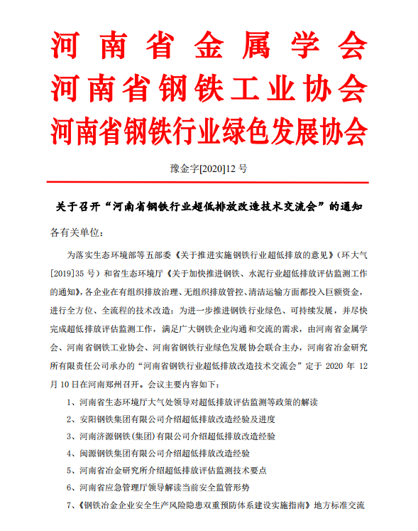 关于召开“河南省钢铁行业超低排放改造技术交流会”的通知