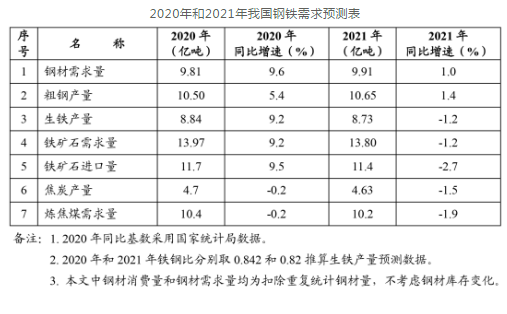 综上,根据国内外经济发展形势以及国内下游行业的发展情况,我院对2020年和2021年我国钢铁需求预测结果如下: