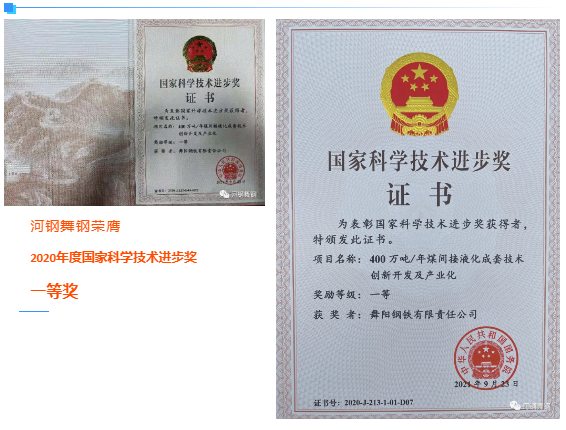11月3日,2020年度国家科学技术奖励大会在人民大会堂隆重举行。河钢舞钢作为主要完成单位参与完成的《400万吨/年煤间接液化成套技术创新开发及产业化》项目荣获国家科学技术进步奖一等奖。这是继河钢舞钢《特厚钢板生产关键技术研发与创新》项目获2013年度国家科学技术进步奖二等奖,《高品质特殊钢绿色高效电渣重熔关键技术的开发和应用》项目荣获2019年度国家科学技术进步奖一等奖之后,获得的又一项国家级殊荣。