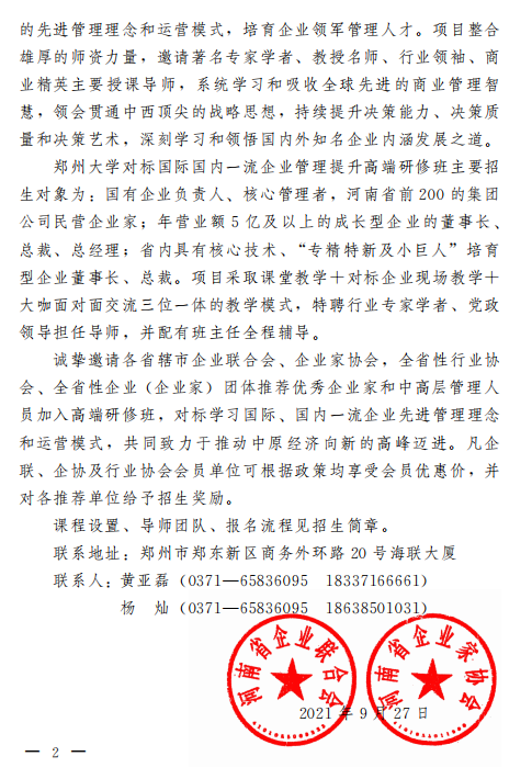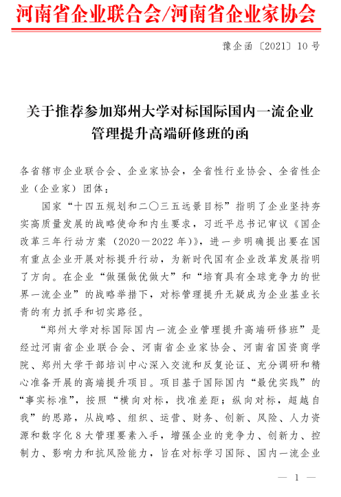 关于推荐参加郑州大学对标国际国内一流企业管理提升高端研修班的函