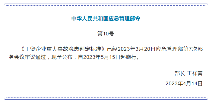 第十五条 本标准自2023年5月15日起施行。《工贸行业重大生产安全事故隐患判定标准(2017版)》(安监总管四〔2017〕129号)同时废止。