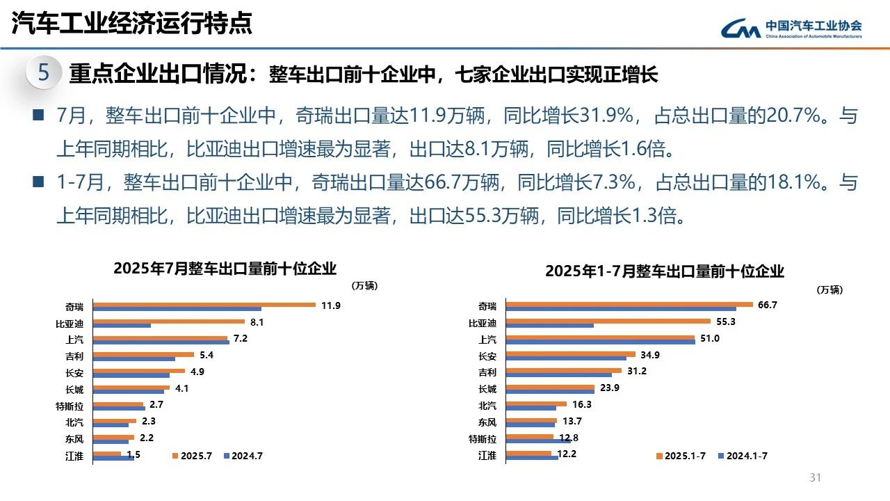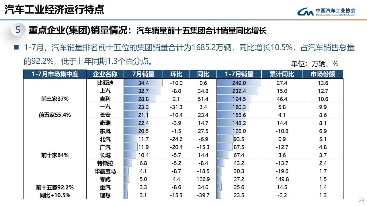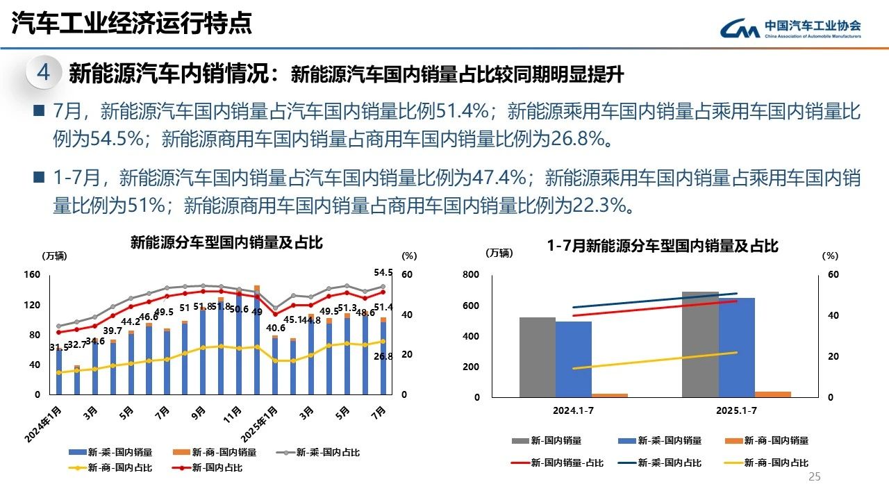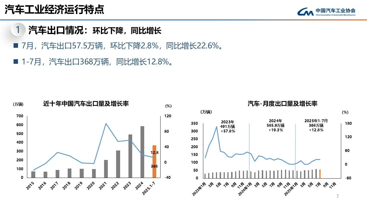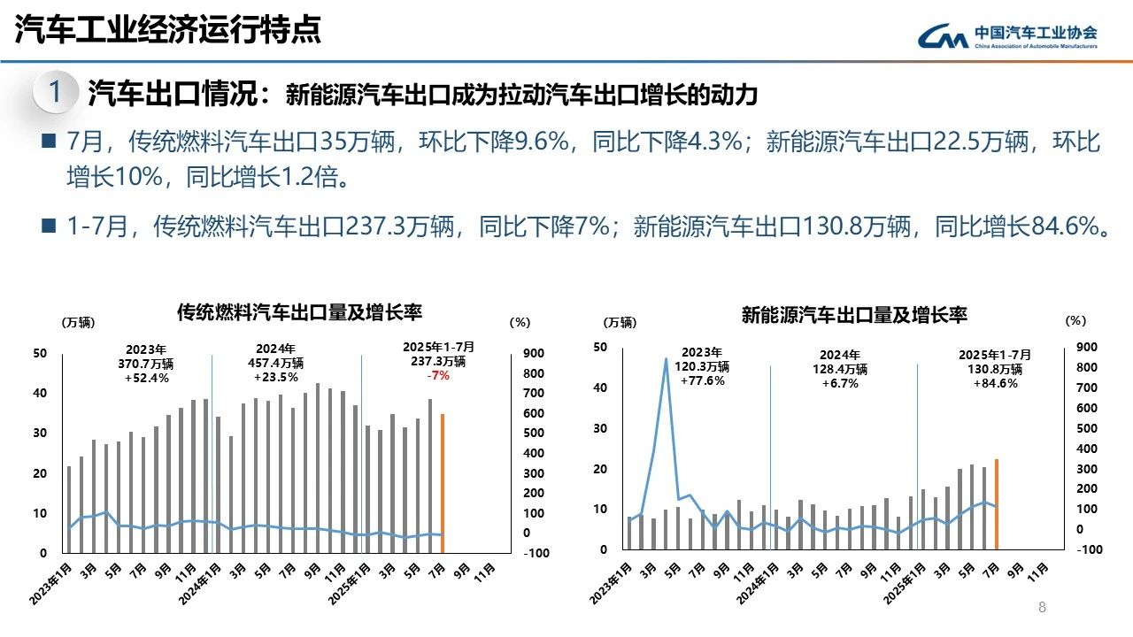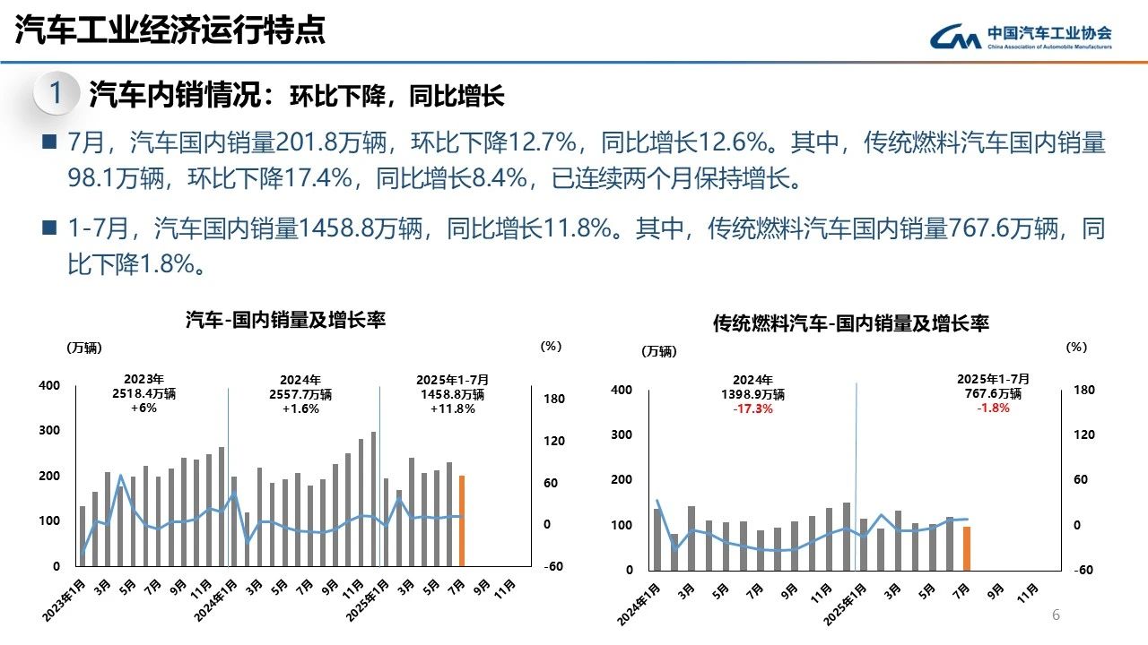 据中国汽车工业协会分析,7月,车市进入传统淡季,部分厂家安排年度设备检修,产销节奏有所放缓,环比呈现季节性回落。从行业市场环境看,以旧换新政策效果继续显现,行业综合整治“内卷”工作取得积极进展,企业新车型持续投放,助力车市平稳运行,同比实现增长。其中,新能源汽车延续快速增长态势,汽车出口保持平稳。