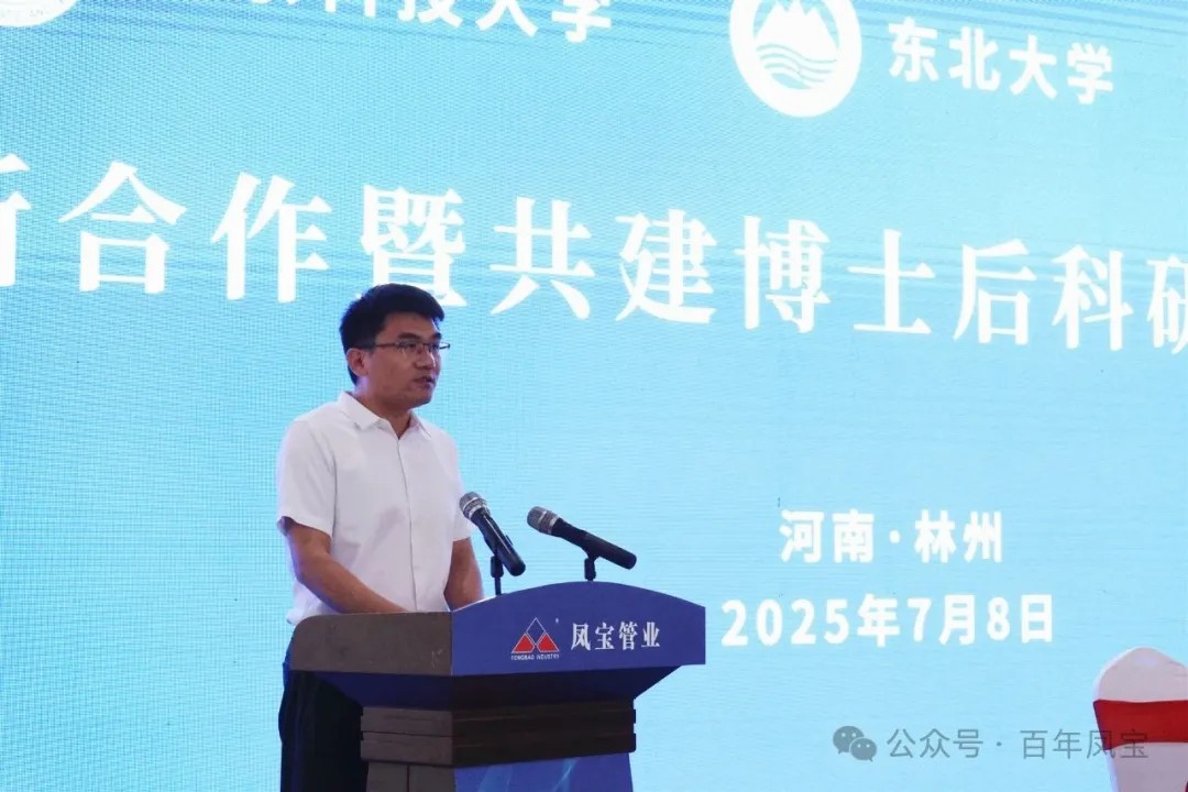 凤宝特钢总经理、凤宝管业董事长李静敏向长期以来关心、支持凤宝发展的各级领导、政府部门表示衷心的感谢。他介绍了科技创新合作共建博士后科研工作站情况。表示,凤宝将以此为新起点,倾力将博士后科研工作站打造成为:服务产业升级的“核心引擎”,工作站将紧密对接国家产业发展规划,聚焦高端装备制造、新材料等战略性新兴产业方向,围绕管材领域关键核心技术,依托两校顶尖科研力量联合攻关,突破“卡脖子”技术,产出一批具有重大价值、引领产业升级的原创性成果,为企业高质量发展提供坚实支撑;引育高端人才的“凤宝磁场”,我们将联合两校,制定具有国际竞争力的博士后引育计划,吸引海内外优秀博士智汇红旗渠;深化校地企融合的“示范标杆”,我们期待与北科大、东大在联合承担国家和省级重大科研项目、共建高水平实验室、联合培养高层次人才等方面开展更深更广合作,努力打造校地企融合创新共赢典范;赋能凤宝发展的“智慧源泉”。将以最高的政治站位、最大的合作诚意、最优的资源保障,举全公司之力,确保共建博士后工作站行稳致远、硕果盈枝。