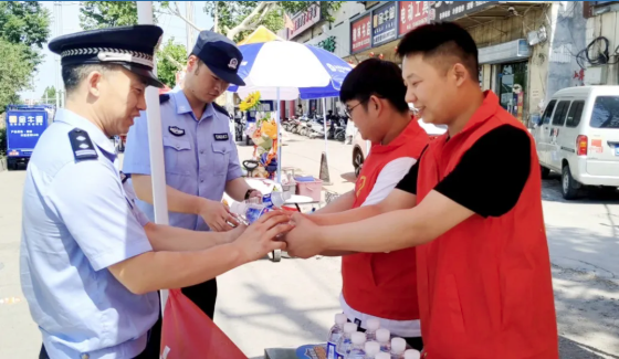 “你们辛苦了,请喝水!”志愿者们还主动为在考点现场服务的公安民警和环卫工人送去了清凉解渴的矿泉水。