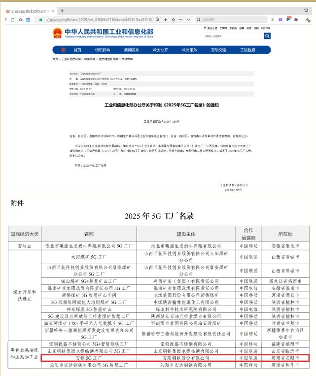 近日,国家工业和信息化部公布《2025年5G工厂名录》,其中,“安钢5G工厂”成功入选。这是河南钢铁集团在智能制造和数字化转型领域再次获得国家级认可,标志着安阳基地在“5G+工业互联网”建设与应用上达到先进水平。