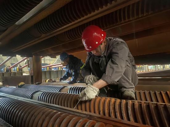自“质量月”活动启动以来,一炼轧作业部热处理作业区以严把产品质量关为前提,通过优化过程管控、强化岗位练兵等举措,全方位挖掘设备和产品潜能,形成了齐抓共管的质量提升格局。一系列扎实行动为“质量月”提供了有力保障,图为9月8日,该作业区组织人员对淬火机喷水口进行深度清理,从根本上保障后续热处理淬火工艺质量稳定可靠。(索妮娅)