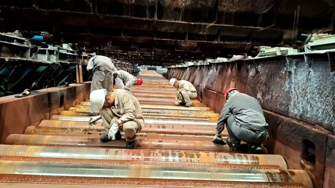 “质量月”期间,为切实保障产品质量,二炼轧作业部炉卷作业区在轧制 Mn13高锰耐磨钢前,组织干部职工疏通层流下集管,避免出现喷嘴出水不均问题,以提升板形质量。经过处理,使用端压力不低于 1.3MPa,侧喷水柱喷射范围位于辊道 1/3-2/3 处,完全满足生产工艺要求。图为职工在层流辊道上精细疏通的场景。(贾莎)