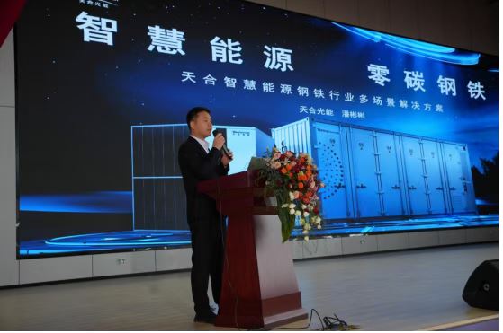 天合光能华北区技术负责人潘彬彬作《智慧能源 零碳钢铁 天合智慧能源钢铁行业多场景解决方案》技术报告,他表示钢铁行业需在2025年满足碳达峰要求、三年内实现碳排放峰值降低30%,而光伏与储能是关键绿色电力手段,打造“光伏+储能”一体化方案,可以适配钢铁厂区不同用能场景,同时通过智慧能源管理平台实现光储荷协同调度,提升能源利用效率。方案已落地多家钢铁企业,未来将持续深化技术创新,推动钢铁行业向零碳方向稳步迈进。