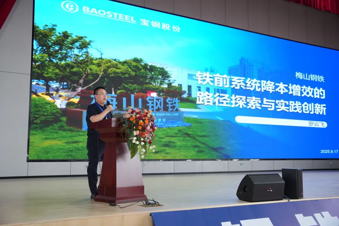 梅钢炼铁厂生产技术室主任助理罗云飞作《梅山钢铁铁前系统降本增效的路径探索和实践创新》技术报告,介绍梅钢铁前系统通过对标找差、能源极致管控、原料结构动态优化、设备柔需检修及智能模型研发等举措降本增效实践。