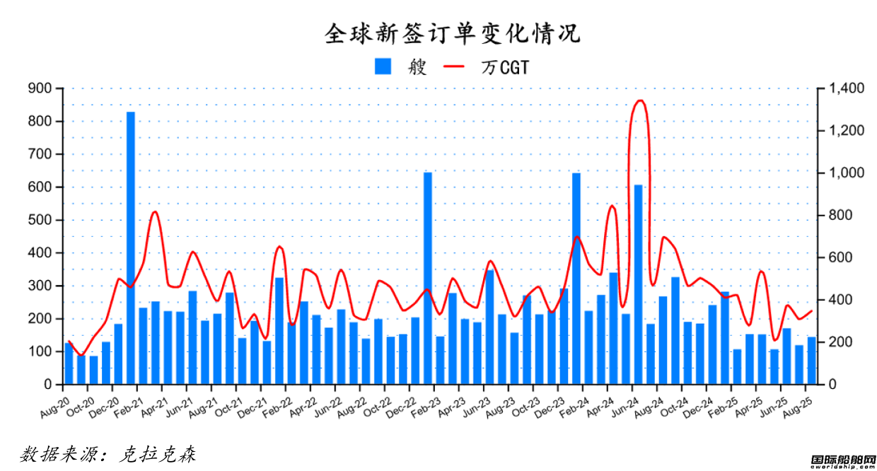 根据克拉克森最新数据统计(截至2025年9月10日),2025年8月份全球新签订单142艘,共计3,484,252CGT。与2025年7月份全球新签订单117艘,共计3,079,869CGT相比较,数量环比增加25艘,修正总吨环比上升13.13%。与2024年8月份全球新签订单266艘,共计6,963,830CGT相比较,数量同比减少124艘,修正总吨同比下降49.97%。