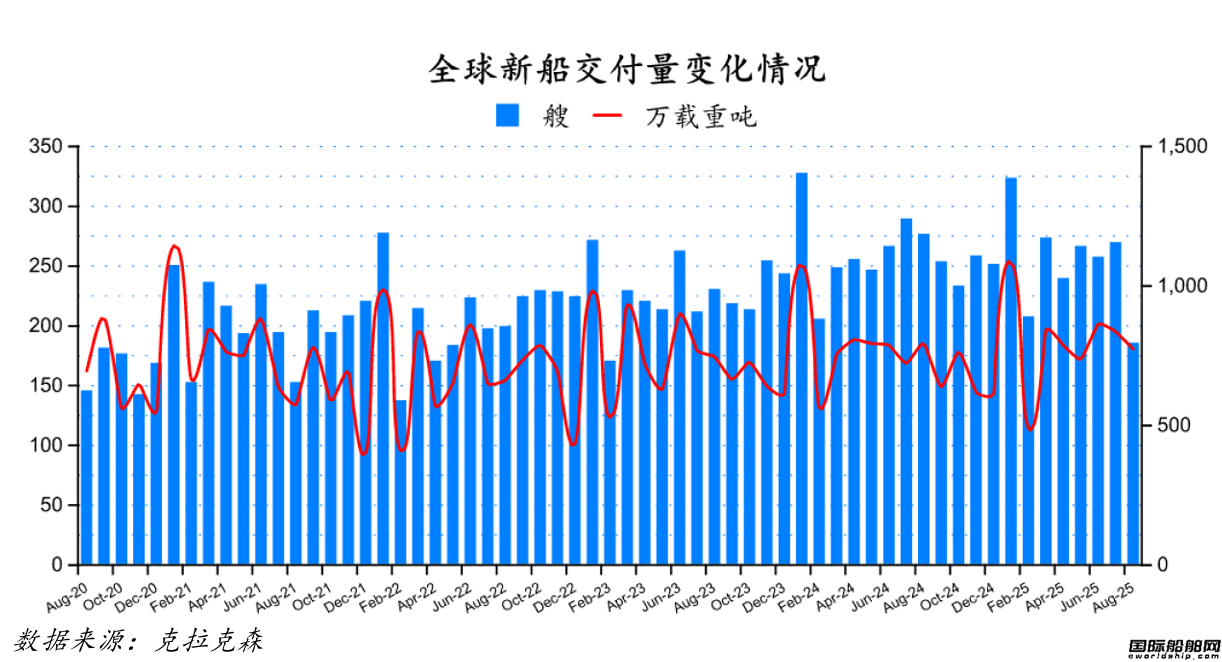 2025年8月份全球船厂共交付新船185艘,共计7,739,954载重吨。与2025年7月份全球新船交付订单269艘,共计8,366,692载重吨相比较,数量环比下降31.23%,载重吨环比下降7.49%。与2024年8月份全球船厂共交付新船276艘,共计7,960,917载重吨相比较,数量同比下跌32.97%,载重吨同比下降2.77%。