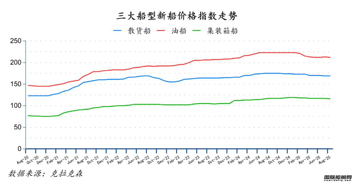 8月份散货船新船价格指数环比持平,为169点;油船和集装箱船新船价格指数均环比下跌1点,分别为212点、116点。