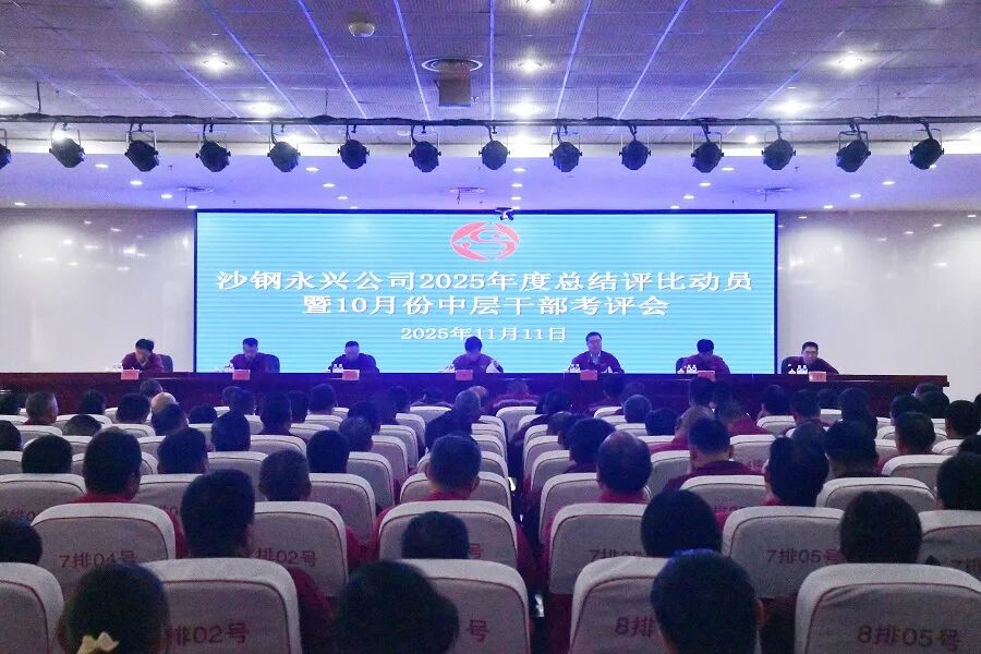 11月11日,沙钢永兴公司召开2025年度总结评比工作动员会议暨10月份中层干部考评会。会议就扎实做好总结评比工作进行全面动员和安排部署,号召全体干部职工以总结评比为抓手,统一思想、提高认识、明确目标、鼓舞士气,为2026年工作开好局、起好步提供新动力,为公司应对新挑战、把握新机遇,推动转型升级、高质量发展奠定坚实基础。公司领导李增伟、高文平、杨武、邢开春、刘品华、于滨海、朱荣明出席会议,全体中层以上干部和管理人员、班组长、职工代表参加了会议。会议由副总经理邢开春主持。