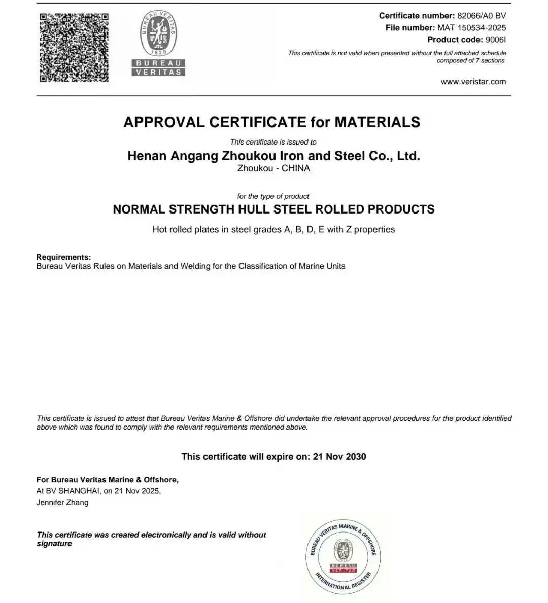 近日,周口基地宽厚板产品成功获得中国、韩国、法国等多国船级社认证,这一成果标志着周口基地的生产技术水平迈向新台阶,具备了进入全球高端船舶制造市场的通行证。