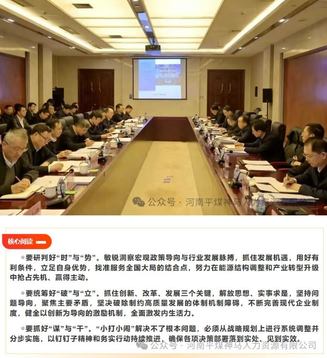 李毛强调,要研判好“时”与“势”。敏锐洞察宏观政策导向与行业发展脉搏,抓住发展机遇,用好有利条件,立足自身优势,找准服务全国大局的结合点,努力在能源结构调整和产业转型升级中抢占先机、赢得主动。要统筹好“破”与“立”。抓住创新、改革、发展三个关键,解放思想、实事求是,坚持问题导向,聚焦主要矛盾,坚决破除制约高质量发展的体制机制障碍,不断完善现代企业制度,健全以创新为导向的激励机制,全面激发内生活力。要抓好“谋”与“干”。“小打小闹”解决不了根本问题,必须从战略规划上进行系统调整并分步实施,以“钉钉子”精神和务实行动持续推进,确保各项决策部署落到实处、见到实效。